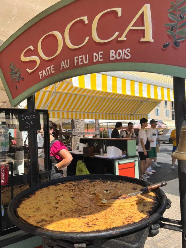Socca is a type of thick unleavened chickpea flour pancake and the recipe came from his great-aunt Tereza who moved from Genova to Nice over 80 years ago and brought the recipe with her.