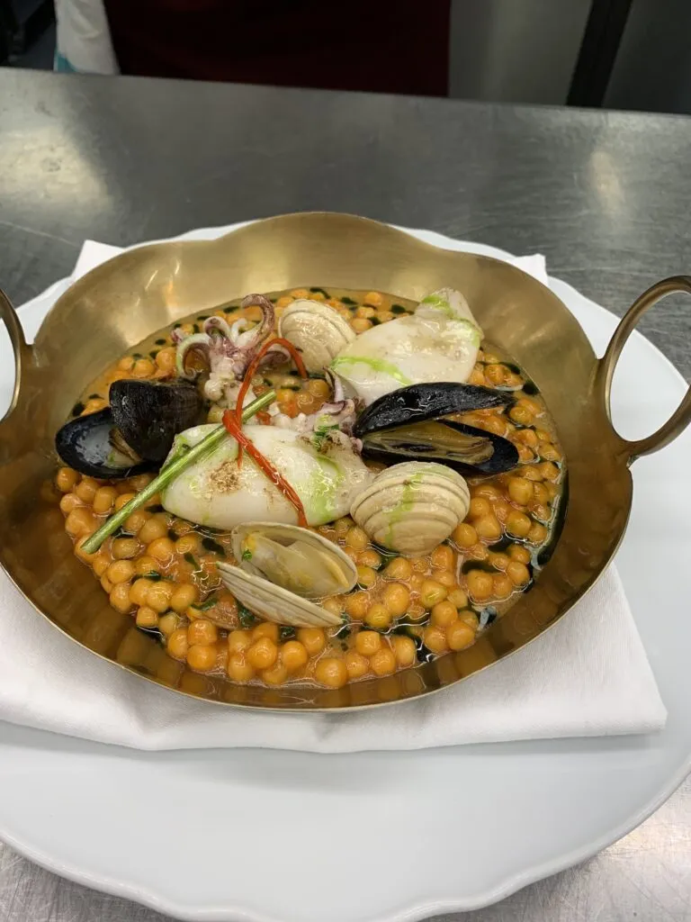 Somaia: The seafood. Straight from the sea—you just squeeze lemon and eat mussels, prawns, everything. Infact, the mussels on our dish in the fregola frutti di mare are inspired by that seaside feeling, but then we add a bisque, butter, to create this rich, elevated dish. It’s another dish my grandma used to make stuffed mussels. You open them, stuff them, close them again, and cook them in tomato sauce. But, in the style of blending regions, I serve it with fregola, a small pasta shape from Sardinia, it’s almost like a risotto.