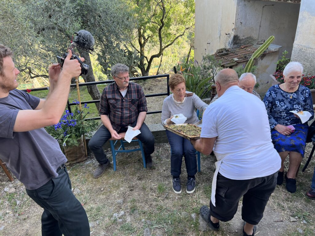 Aldo and his wife Luigina gathered everyone outside their tavern, where we shared the freshly baked focaccia as the sun set among the olive trees. There was also focaccia verde, filled with chard, egg, and cheese, and we tried all the variations because one focaccia is never enough for us (even after a day’s pasta filming).