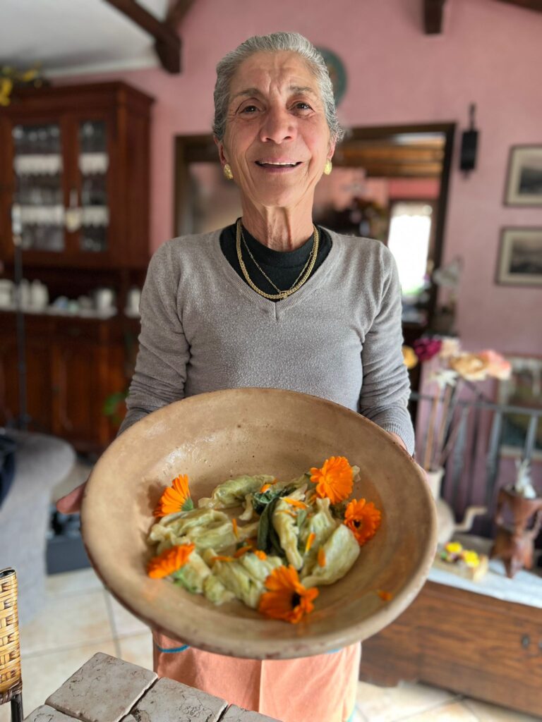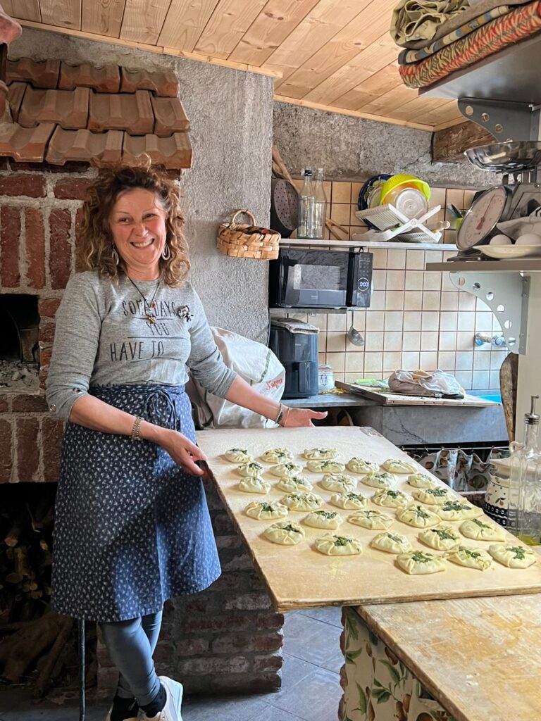 Here, Floriana prepared Turle, a ravioli style found only in this village! The filling combines leeks and potatoes with marjoram and wild mint, and they’re served with butter, sage, and local wild flowers called calendule. Yes, flowers, and yes, they not only look beautiful, but you can eat them too!