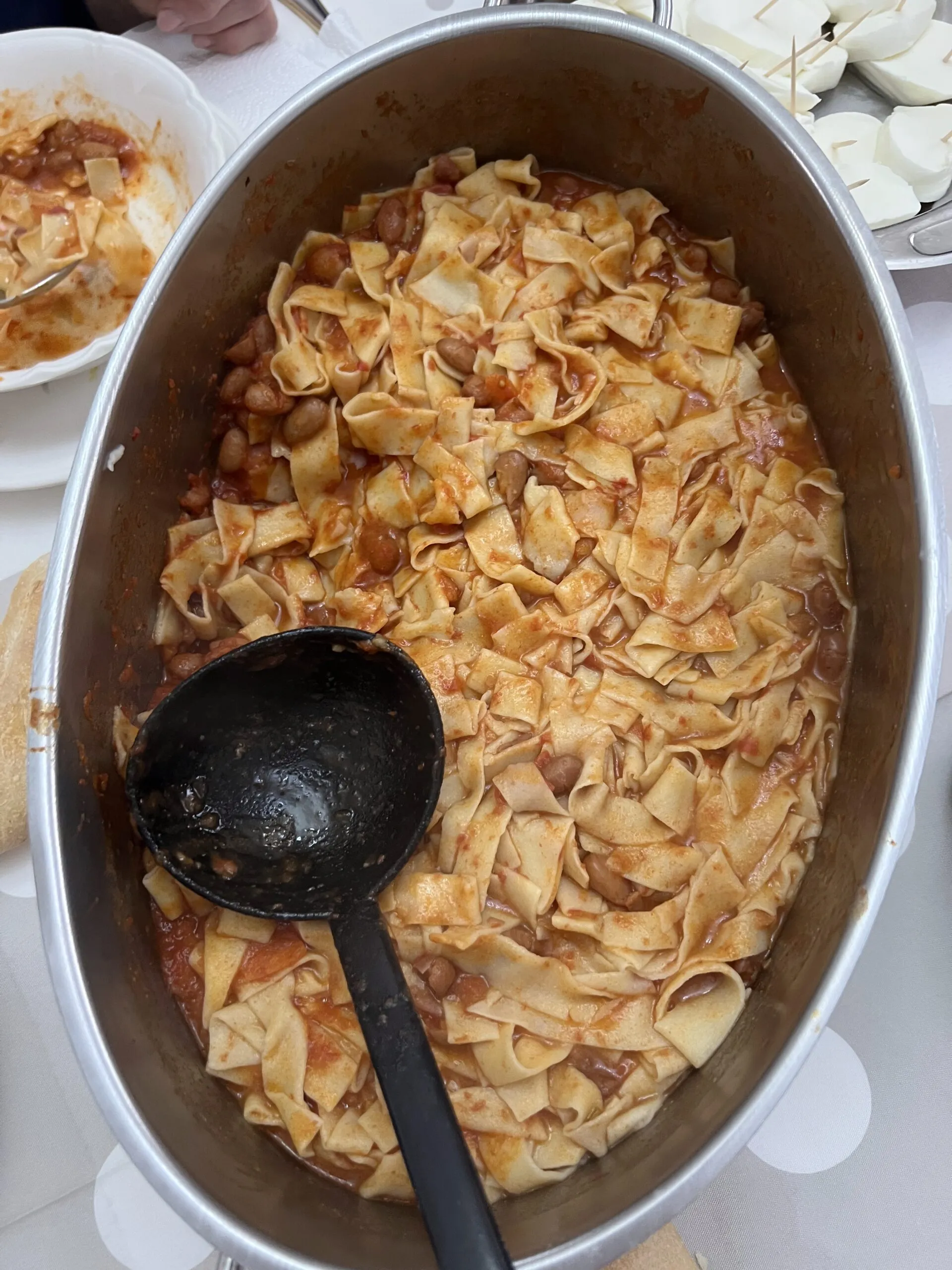 On a recent trip in Abruzzo, we stopped in a small town called Frisa, tucked among the rolling hills where olive harvesting was in full swing. (Check out our Behind the Scenes video for more videos about processes like this). The olive nets were laid out beneath the trees, and the air smelled of the peppery phenols and woodsmoke. While we watched the harvesting in action, Anna Maria was inside the kitchen preparing one of the region’s most comforting dishes: sagne e fagioli and our camera men managed to capture it. Her pasta is a hand-shaped ribbon made using durum wheat flour and it’s layered with a borlotti bean and tomato sauce. It was exactly the kind of meal that feeds a hardworking family at harvest time. And although we were just watching, we tucked in too.