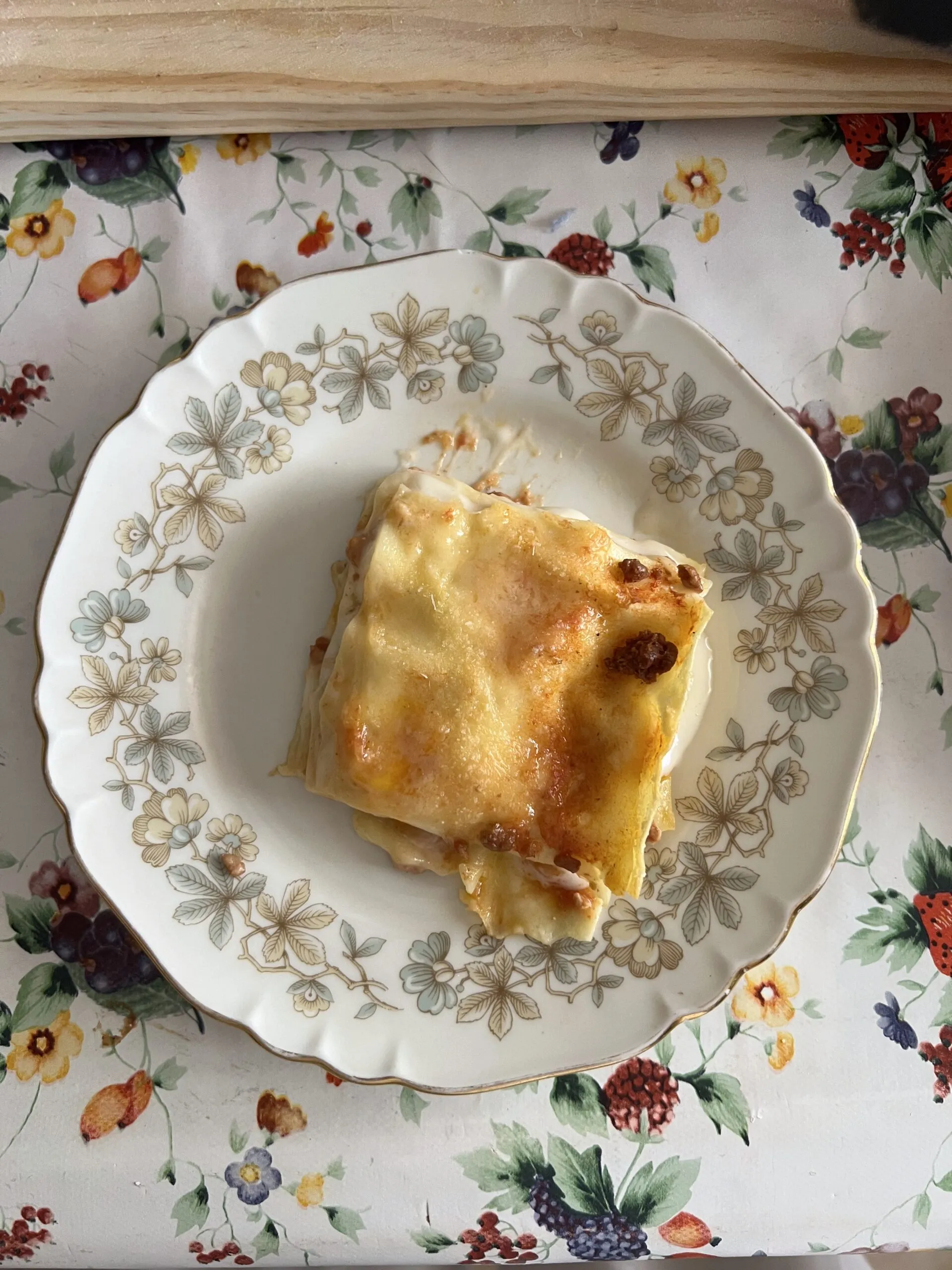 5. Assemble the lasagne: Preheat the oven to 200 °C. Spread a layer of ragù and béchamel on the bottom of a baking dish. Add a layer of pasta, then alternate layers of ragù with Parmigiano and béchamel with Parmigiano. Finish with a final layer of ragù and a little béchamel on top.